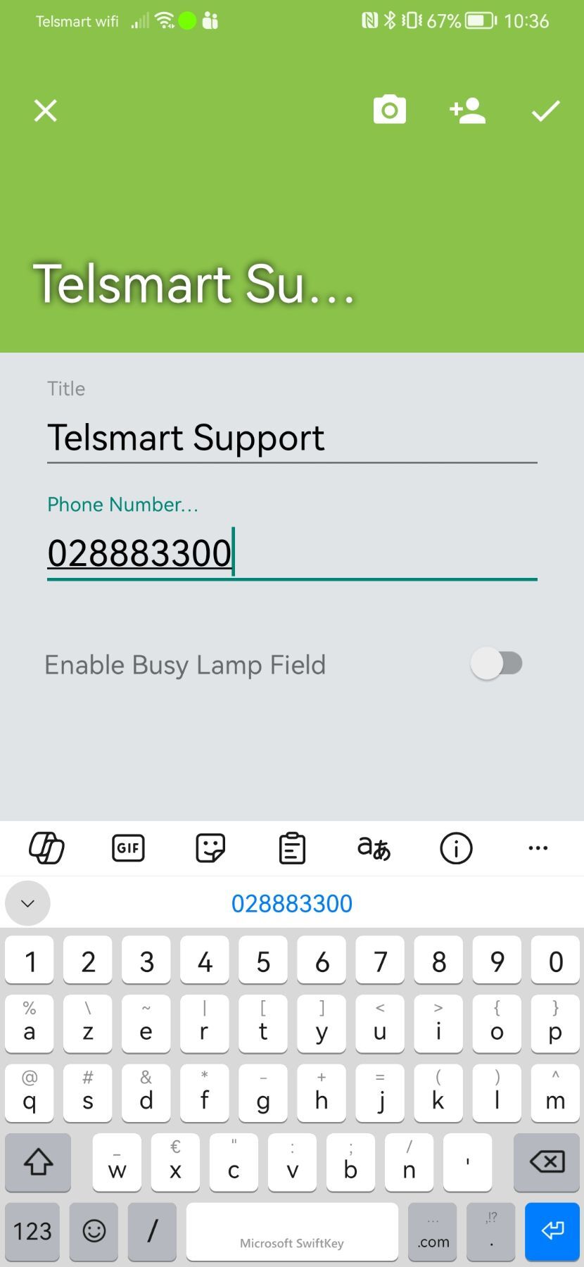 4. Nous ajoutons un nom et un numéro, puis nous appuyons sur le symbole ✓.